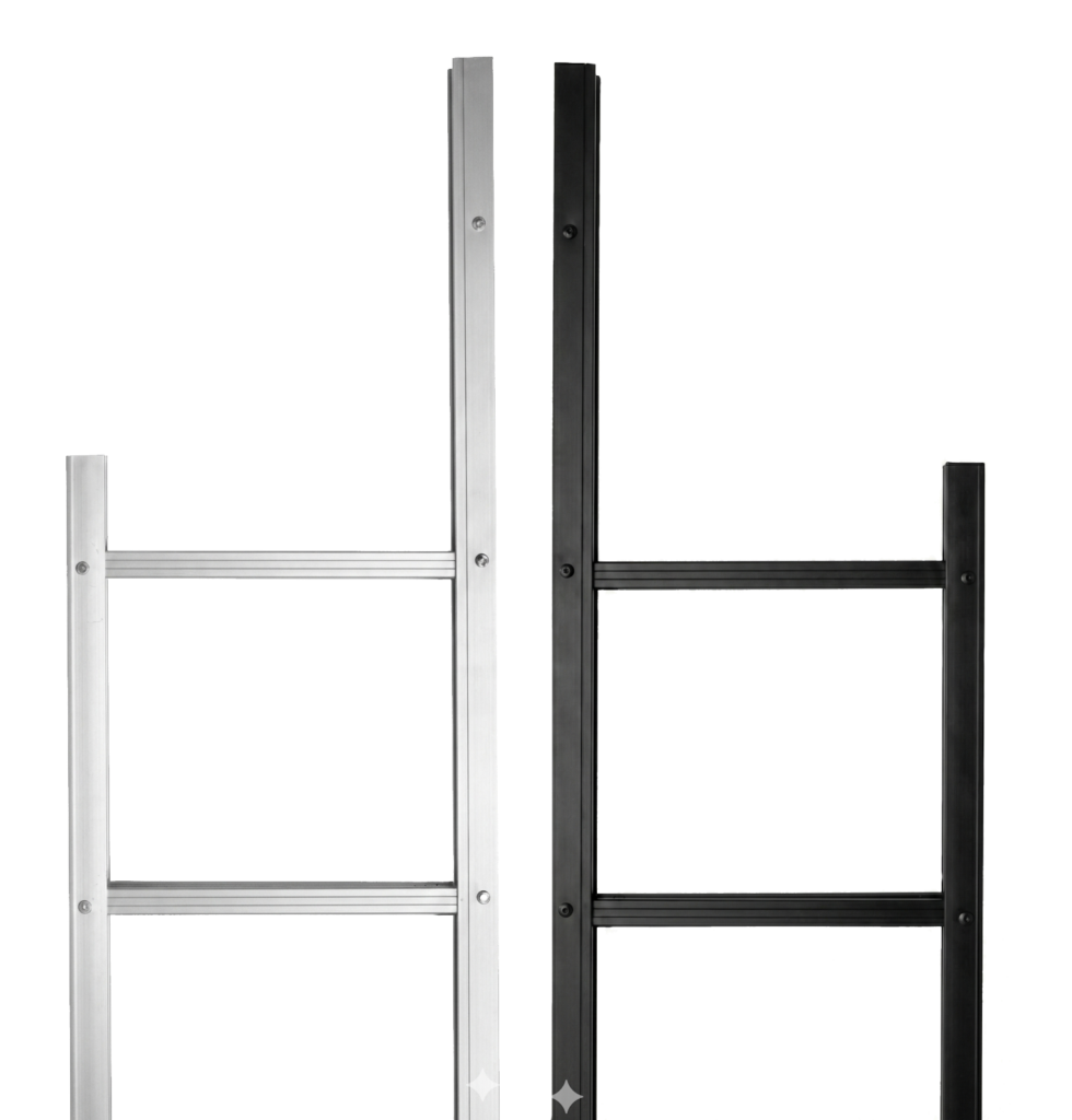 Modum brannstige lagerføres i tre varianter: Naturlig aluminium, sort og hvit. Sort og hvit farge erer pulverlakkert og passer bygg der stigen skal gå diskret i ett med fasaden. Stålfargen gir et mer industrielt, moderne uttrykk. Vi kan levere andre farger på forespørsel (alle RAL-farger er tilgjengelig for pulverlakkering).